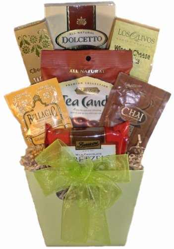 - This green beveled tray is filled with Dolcetto wafer roll, cheese biscuits, chocolate wafers, tea candy bag, Chai tea, Bellagio hot cocoa and chocolate pretzels.